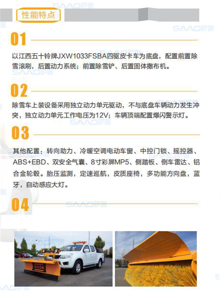 皮卡除雪車專用于市政、高速公路匝道、廣場、機場等區(qū)域掃雪、除雪及融雪撒布機等工作,空閑時候小型多功能除雪車可作為巡檢車使用,一車多用。